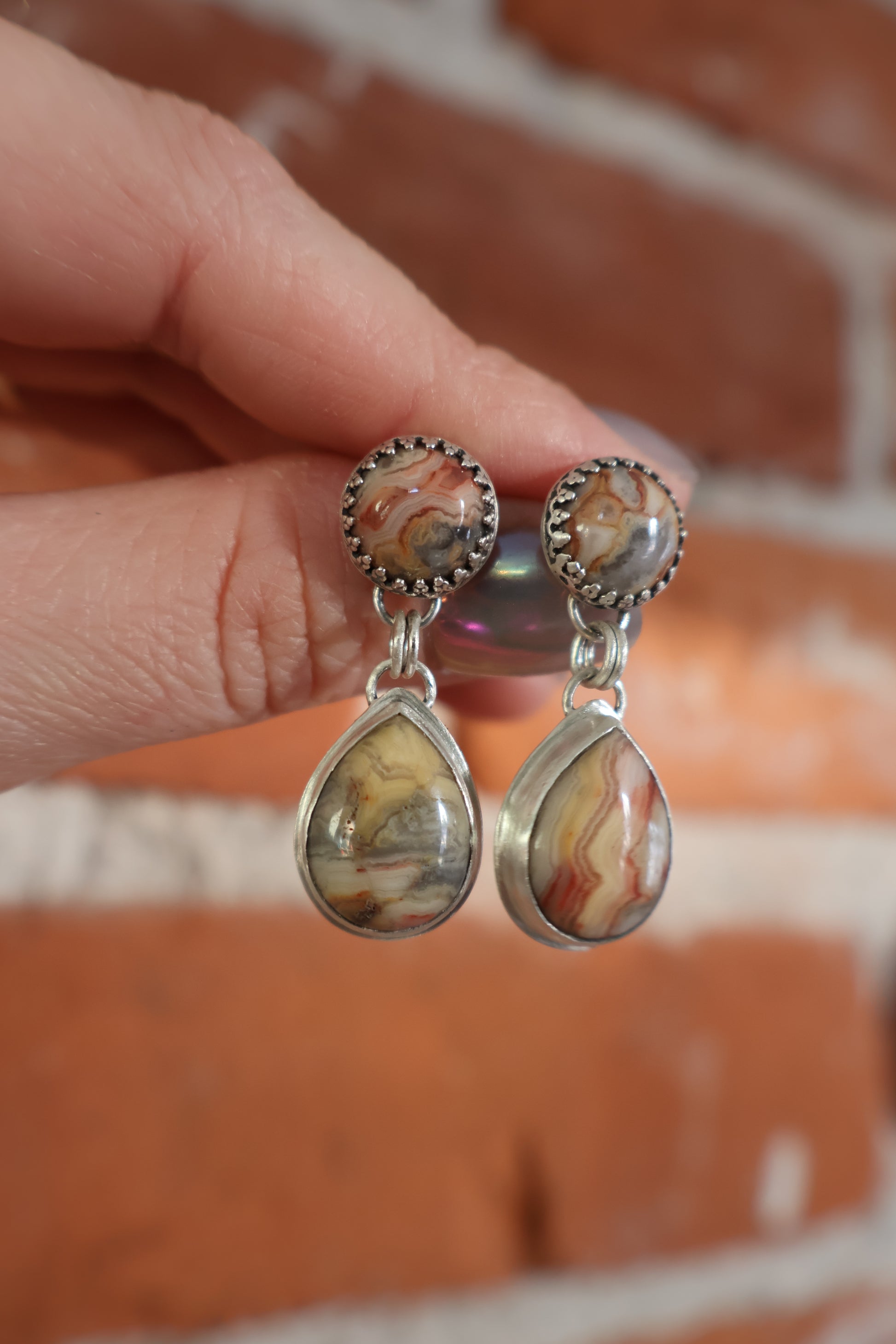 Dangle stud earrings featuring Mexican crazy lace agate stones reminiscent of the red to burnt orange layered rock formations of the American Southwest. Soft matte brushed finish.