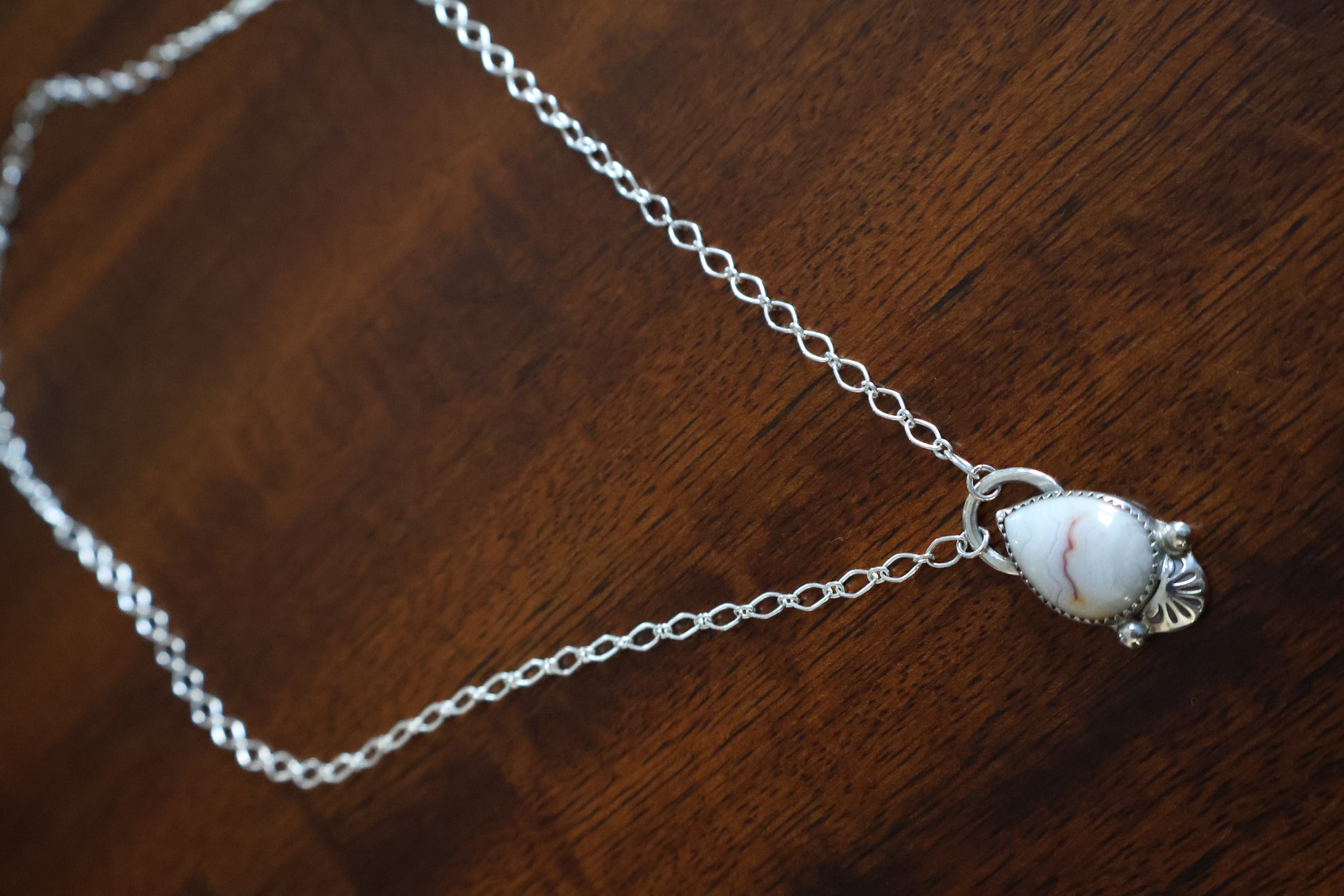 Pear shaped pendant featuring a Mexican crazy lace agate stone and handmade sterling silver embellishments.