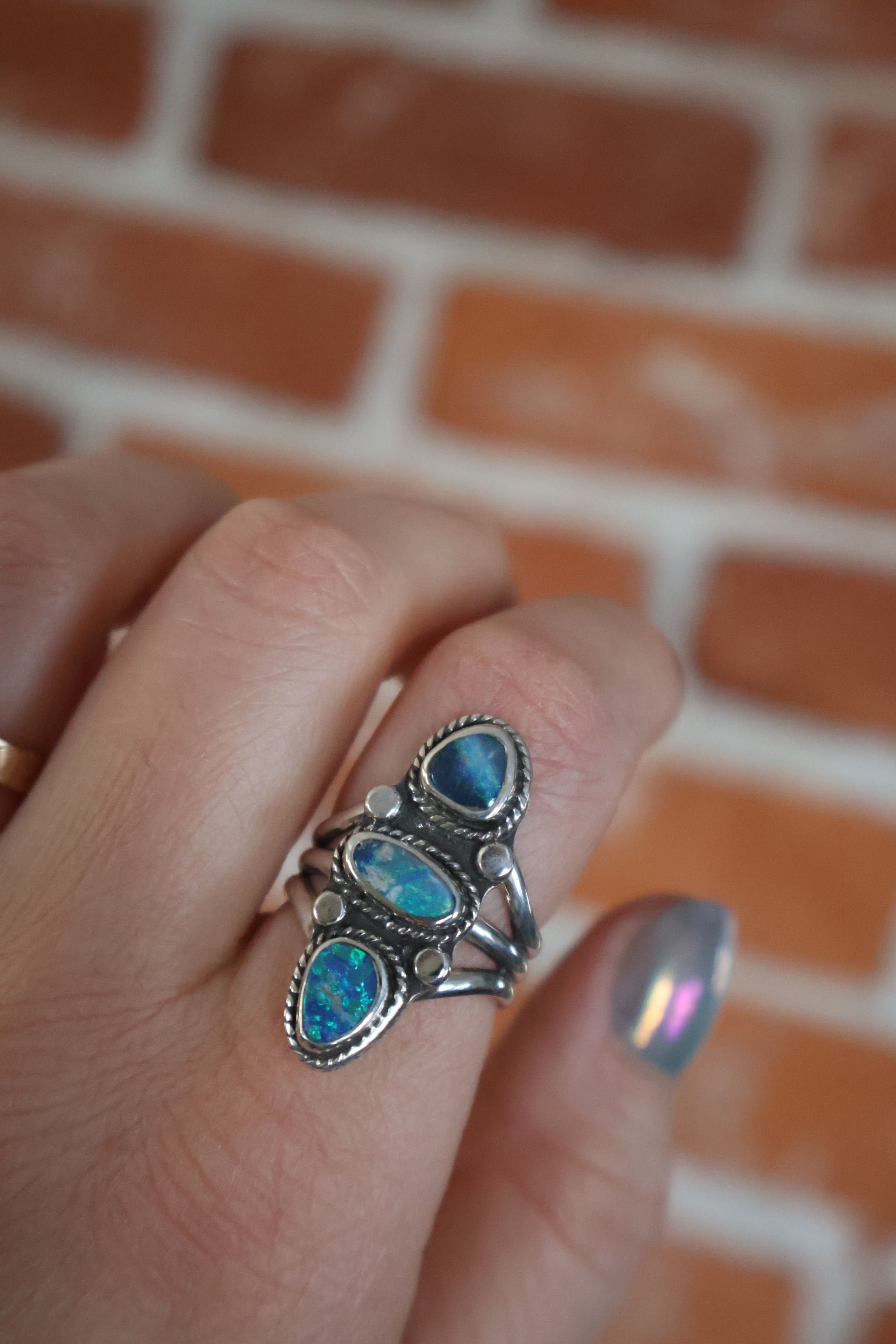 She’s a statement ring that isn’t too big for everyday wear. The stones shine with sparkling iridescent shades of blue and green and flecks of white that look like clusters of stars.